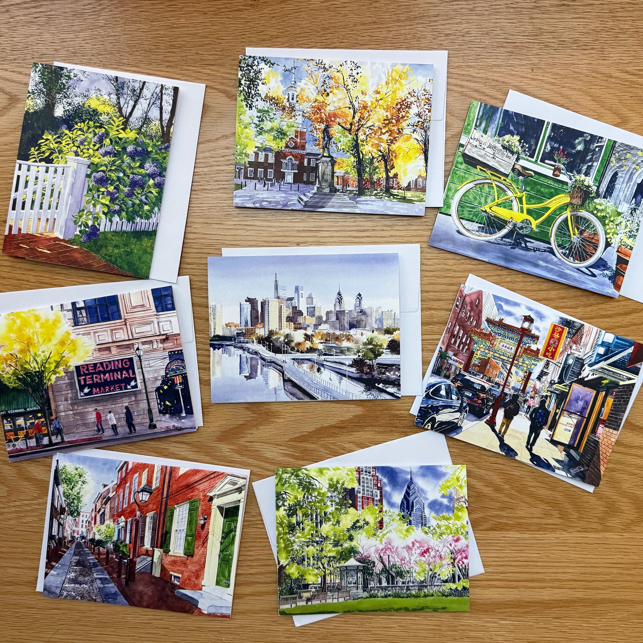 Size A2 folded blank greeting cards printed from my original watercolor paintings. Cards measures 4.25x5.5 folded and come with self sticking white envelopes. Each set ships with gift box